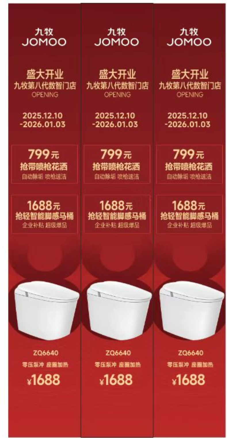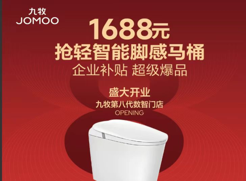 12月10日,值此九牧第八代数字门店盛大开业之际,由企业补贴的超级爆品来了:1688元,即可抢轻智能脚感马桶;799元,可抢带喷枪花洒。更有专属特惠直降到底,爆款单品限时秒杀、满额豪礼连环送,一站式卫浴解决方案+管家级安装服务,承包你家的舒适与安心。