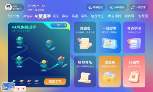 12 寸护眼大屏。硬件级低蓝光 + 全域无频闪 + 多层类纸工艺,孩子看课程、做习题、读电子书都舒服,能最大程度保护视力。对比普通平板,它的护眼效果更专业,不用额外买护眼膜、防蓝光眼镜,省钱又省心。。