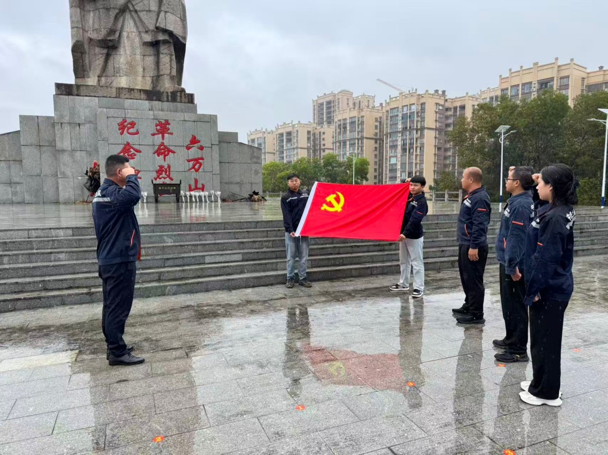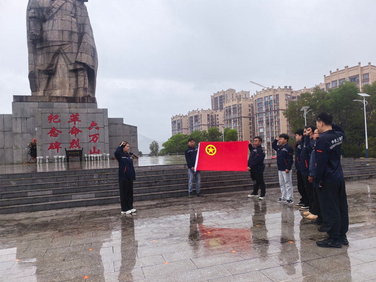 苍松翠柏映忠魂,细雨含情寄哀思。活动当天,天空飘起淅淅沥沥的小雨,雨滴打在六万山革命烈士纪念碑的基座上,更添肃穆氛围。全体党员、团员手持白菊,怀着无比沉重与崇敬的心情列队肃立,目光坚定地望向纪念碑。在低沉的氛围中,大家依次缓步上前,向革命先烈敬献鲜花,小心翼翼地整理花束,而后静静伫立在碑前默哀致敬,雨水与哀思交织,以此深切悼念在民族解放事业中英勇献身的革命先烈,缅怀88年前在南京大屠杀中惨遭屠戮的30多万同胞。默哀毕,在党支部书记的带领下,全体党员面向鲜红的党旗高举右拳,任凭雨水顺着脸颊滑落,铿锵有力的誓言穿透雨幕回荡在山间,完毕后团支部书记带领团员青年面向鲜艳的团旗紧握右拳庄严宣誓,两次宣誓都承载着对革命精神的传承,也是对强国使命的承诺,彰显了党团同心、薪火相传的坚定信念。