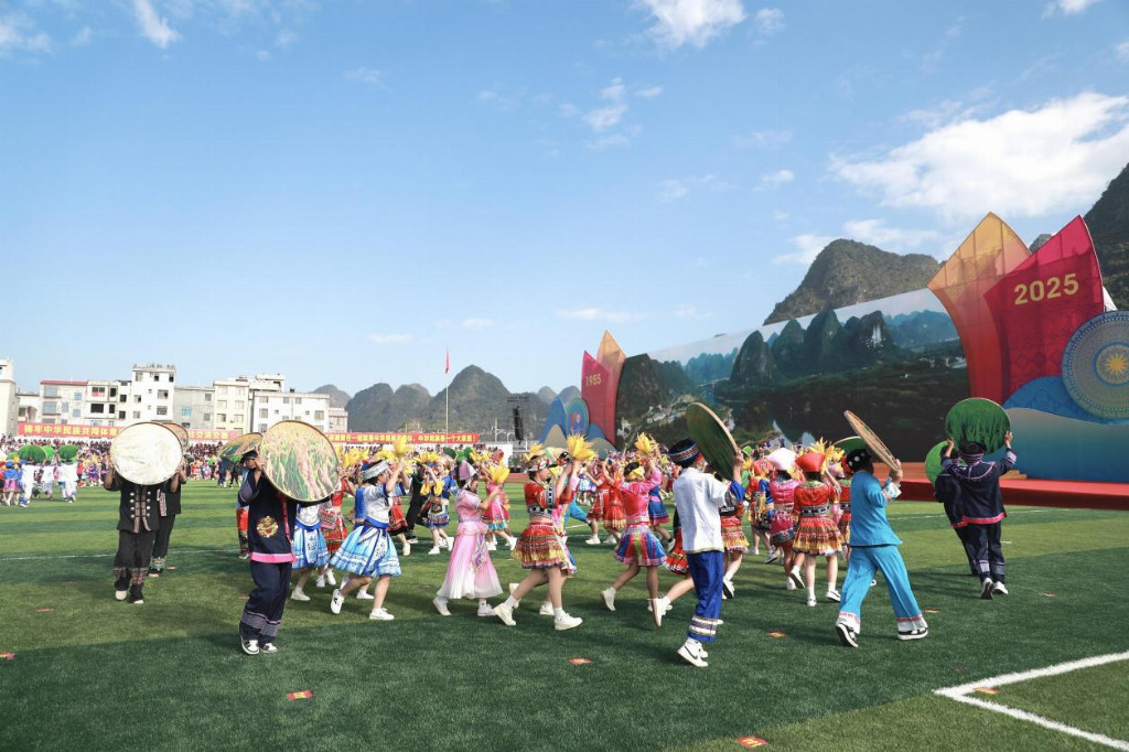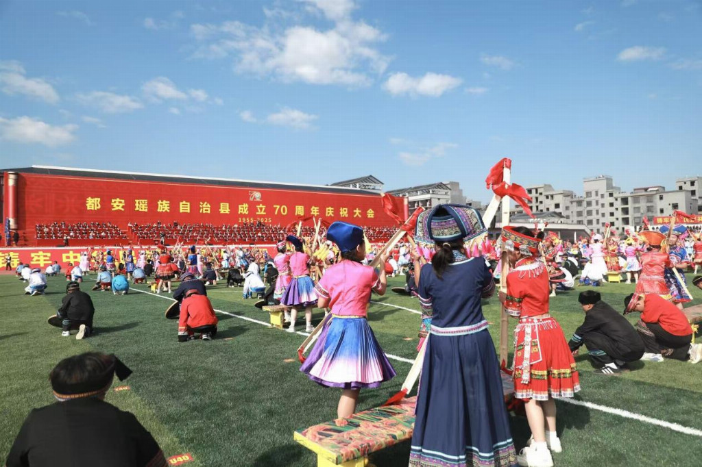 据了解,都安70周年县庆期间还举办了系列特色活动:中央民族歌舞团带来高水平慰问演出,供销大集汇聚瑶山特色好物,成就展、书画摄影展全面展现发展成果,非遗展演、山歌擂台赛让民族文化活力绽放,全县上下沉浸在喜庆祥和的氛围中。