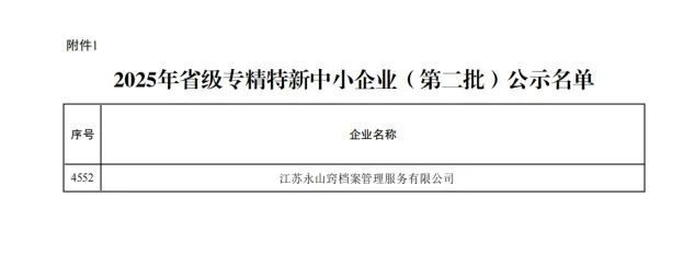 热烈祝贺江苏永山窍档案管理服务有限公司(以下简称“窍楚档案”)荣膺2025年江苏省省级专精特新中小企业称号!