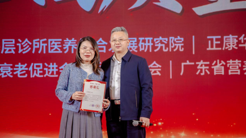 "2025年度医养结合鼎力支持奖",由衷感谢他们为医养事业提供的强大技术资源支持,他们的贡献让我们深刻体会到:携手共进,方能成就伟业。他们是:暨南大学附属第一医院临床营养科主任医师叶艳彬教授、中山大学公共卫生学院郭城教授、上海交大生科院硕士,厢健不晚品牌创始人王剑女士,由正康华药总裁阙和旭先生颁奖。