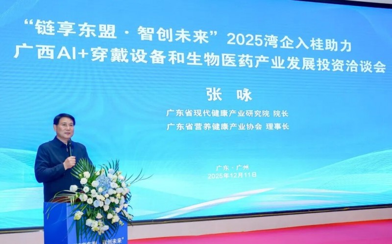 12月11日,由广西壮族自治区人民政府驻广州办事处、广西壮族自治区园区发展和投资促进服务中心联合主办,以“链享东盟·智创未来”为主题的2025湾企入桂助力广西AI+穿戴设备和生物医药产业发展投资洽谈会在广州举办。广西壮族自治区政府驻广州办党组成员、副主任周土智,广东省营养健康产业协会理事长、广东省现代健康产业研究院院长张咏出席活动并致辞。