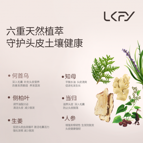 先说说核心的成分,毕竟用在头皮上的东西,安全温和才是底线。露卡菲娅完全不玩虚的,成分表干干净净,没有硅油、酒精这些刺激成分,。它主打人参、当归、知母、何首乌、侧柏叶、生姜等六种植萃精华,都是养发的老熟人:人参和当归能给毛囊深层补营养,让发根长得结实;侧柏叶专门调节头皮油脂,像我这种油头,以前一天一洗还黏腻,现在用它三天不洗头都清爽;姜根能促进头皮血液循环,唤醒那些“沉睡”的毛囊,搭配独家专研的防脱因子,从根源上阻断脱发,比普通防脱洗发水效果更到位。