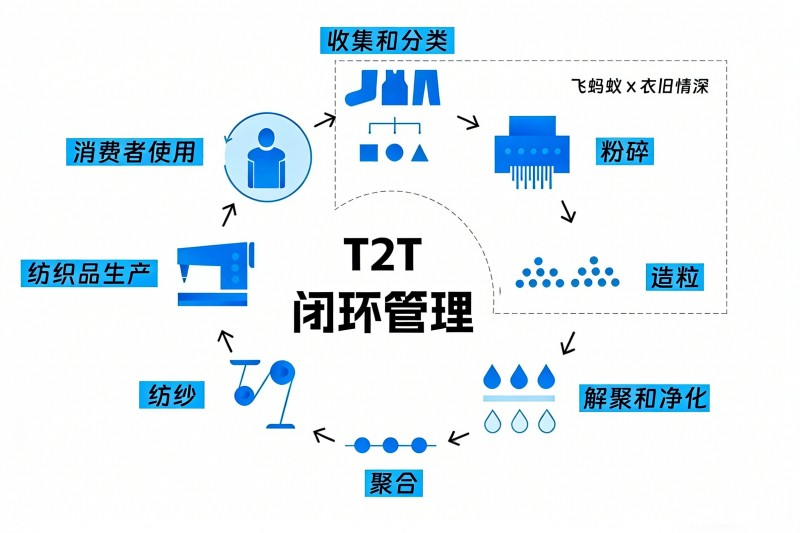 飞蚂蚁始终以技术创新为核心驱动力,深耕纺织品从回收到再生的全链路技术闭环(T2T),致力于破解废旧纺材高值化利用的行业难题。品牌总监邓琦华在演讲中系统阐述了这个以“从衣物到衣物”为目标的创新体系:它突破了传统废纺处理“碎片化、低效能”的局限,构建了覆盖回收、分拣、分解提纯到再生织造的全周期闭环,实现了资源利用率的质的飞跃,为行业提供了可复制、可推广的实践范本。