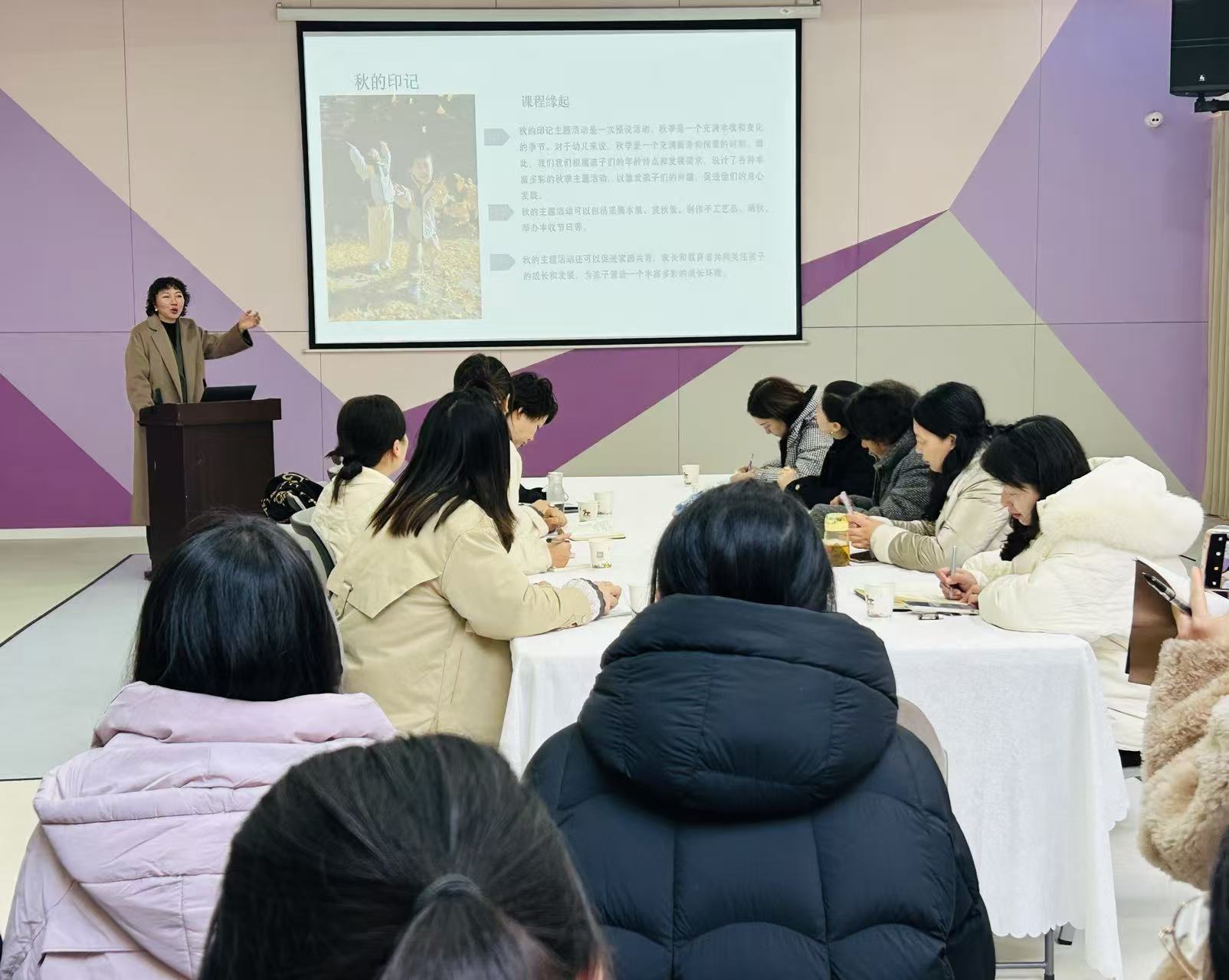 活动伊始,木马幼儿园白园长带来专题经验分享。她从幼儿园初探自然教育的核心原则入手,深入剖析了自然教育与幼儿园户外游戏的必然关联,生动展示了园区生态环境的多元转型:“生态园”升级为互动体验式的“萌宠乐园”,变身烟火气十足的“花园厨房”,进化为挑战成长的“勇者之旅”,蜕变为创意实践的“自然工坊”,让生态空间的教育价值得到充分释放,并以班本课程“秋的印记”为案例,详细拆解了自然教育与户外环境、班级课程深度融合的实操路径,为各园提供了可借鉴的实践样本。