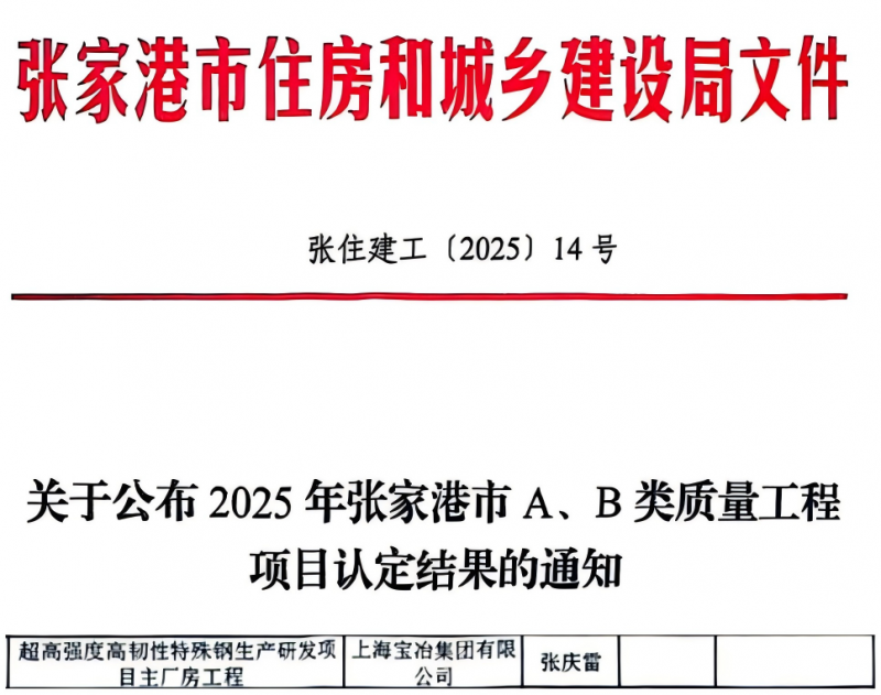 近日,捷报传来,由上海宝冶承建的超高强度高韧性特殊钢生产研发项目主厂房工程荣获2025年江苏省苏州市张家港市B类质量工程项目认定。该项目位于江苏省苏州市张家港市永联工业园区内,主厂房建筑面积102096.01平方米,建筑高度23.65米,结构最大跨度42米。