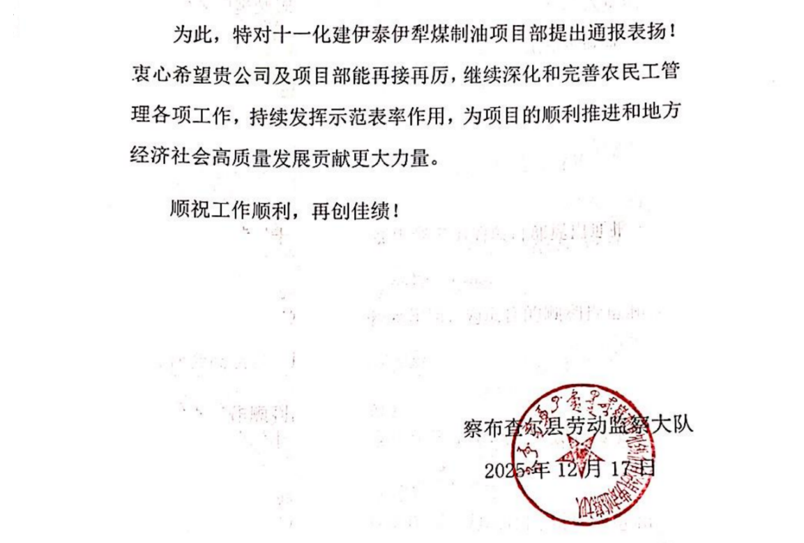 近日,中国化学工程第十一建设有限公司山东分公司承建的伊泰伊犁煤制油工程项目,凭借在农民工管理工作中的卓越表现,收获察布查尔县劳动检查大队发来的表扬信。这一荣誉,是对项目部过往工作的肯定,更是对其社会责任担当的有力见证。