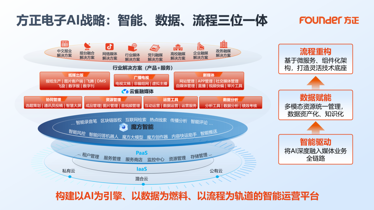 针对行业在范式变革中面临的新课题、新挑战,方正电子以“智能、数据、流程三位一体”为核心战略,构建智媒解决方案:
