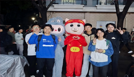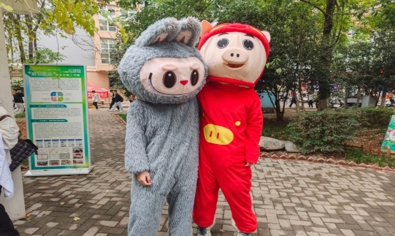 身着“猪猪侠”、“Labubu”等可爱造型玩偶服的部门成员化身“暖心使者”,主动张开双臂,用温暖的拥抱打破人际间的陌生与隔阂,为校园注入了满满的治愈能量与积极氛围。许多路过的同学被这份热情感染,纷纷笑着走上前,与玩偶拥抱、合影。有的同学踮起脚尖比出“耶”的手势,用照片定格下这温馨一刻。原本步履匆匆的校园小道,因此充满了欢声笑语,瞬间变成了一个充满连接与善意的开放空间。