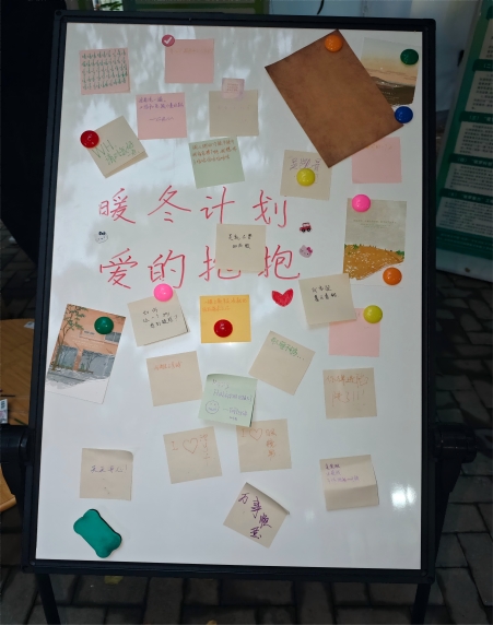 活动现场一块写有“暖冬计划——爱的抱抱”的留言板同样热闹。学生们纷纷拿起笔,将心中所想写下:“愿所有努力都有回报”“被玩偶拥抱的瞬间,所有疲惫都烟消云散了”“感谢这份校园归属感”。彩色便利贴层层叠叠,字迹或稚嫩或有力,既有对自己的鼓励,也有对他人的祝福,成为冬日校园里最动人的“心情备忘录”。