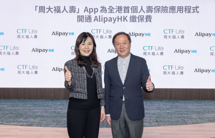 周大福人寿执行董事兼行政总裁叶文杰(右) 及 AlipayHK 行政总裁李咏诗(左)宣布周大福人寿应用程序成为香港首间人寿保险公司开通 AlipayHK 付款。