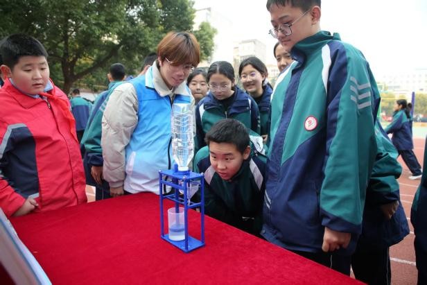 最受学生期待的“奇趣游园”环节,将整个科技·社团节变成了一个大型互动科学乐园。从展现古人智慧的“非遗滚灯”、“榫卯鲁班桥”、“公道杯”,到体现现代科技的“声悬浮装置”、“3D打印机”、“智能机器狗”,展品横跨古今,贯通文理。同学们分年级、分时段有序游园,或动手操作手压抽水机,或围观“饮水鸟”的奇妙摆动,或与智能语音助手对话,或观看写字机精准书写,在各个展台前流连忘返,在亲身体验与互动问答中深化了对科学原理的理解,激发了对科技创新的无限热情。