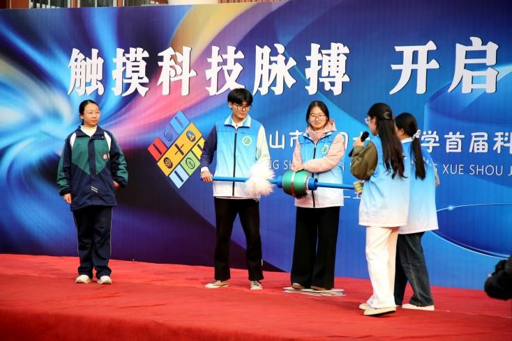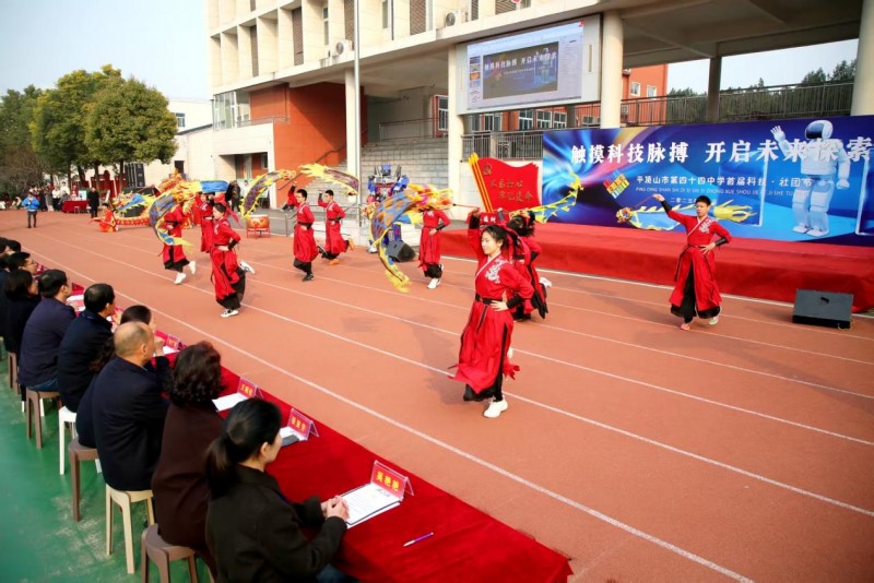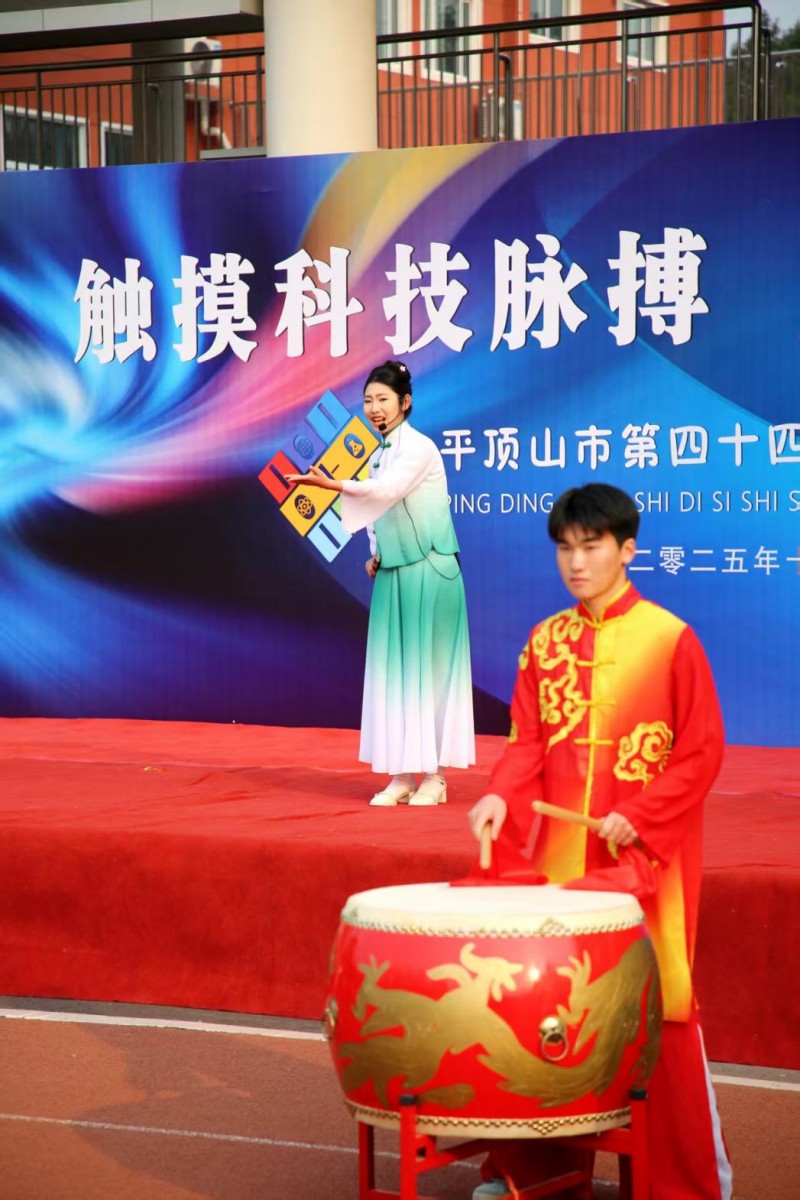 开幕式后,精彩纷呈的科技·社团展演依次上演。舞龙表演、传统艺术与现代科技交融,拉开了“展演”篇章的精彩序幕。学校舞龙队在激昂的鼓点中舞动乾坤,展现了力与美的结合。市四十四中师生展示的马德堡半球实验、融合三种艺术形式的“三艺和鸣”等节目,充分体现了科学与艺术、知识与实践的完美结合,展现了四十四中师生的创新活力与综合素养。平顶山学院带来的“头顶飞花+旋转气球”、“大象鼻子”等科技艺术节目,引发了同学们的阵阵惊叹。