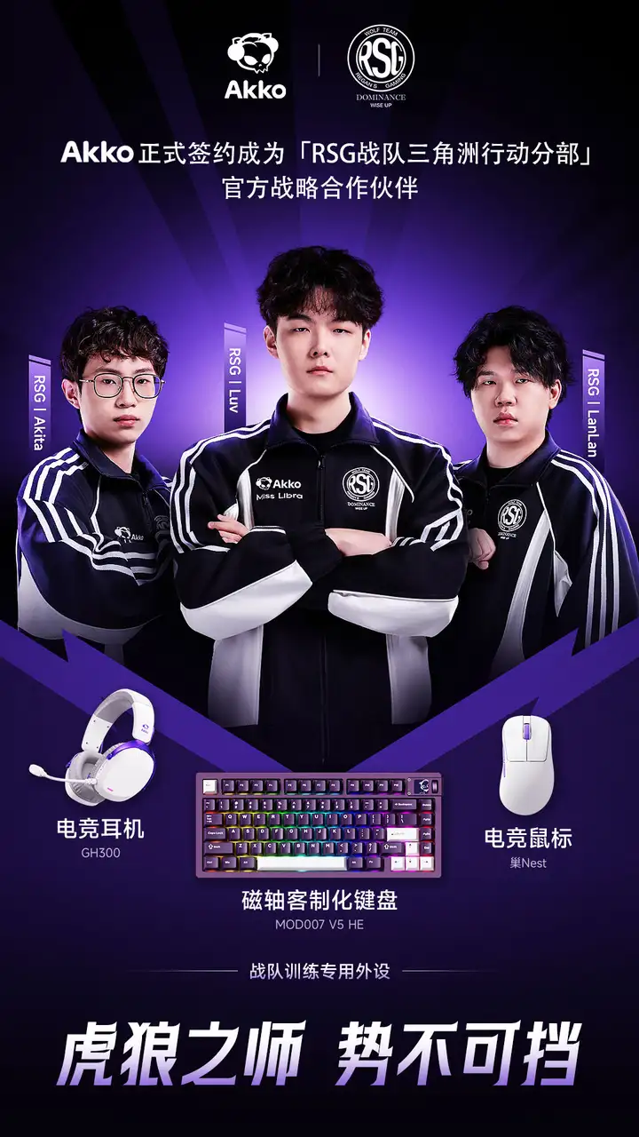 电竞不仅是竞技的艺术,更是文化的传播。RSG战队三角洲行动分部在赛场上展现出的无畏精神与创新活力,和Akko追求潮流、突破边界的品牌基因不谋而合。此次合作,Akko不仅将为战队提供最专业的装备支持,更希望通过双方的优势互补,把职业赛场验证过的技术与经验转化为惠及所有玩家的产品价值,让潮流与竞技碰撞出更多火花。