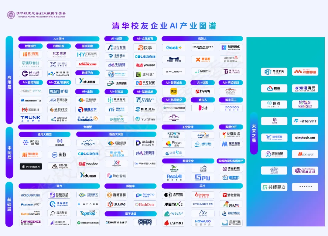 日前,《清华校友企业AI产业图谱》正式发布。图谱由清华校友总会AI大数据专委会主持编制,首次系统梳理清华校友在人工智能领域的产业生态全景,以应用层、中间层、基础层三大技术层级为骨架,并特设未来之星潜力板块甄选高成长性创新力量。