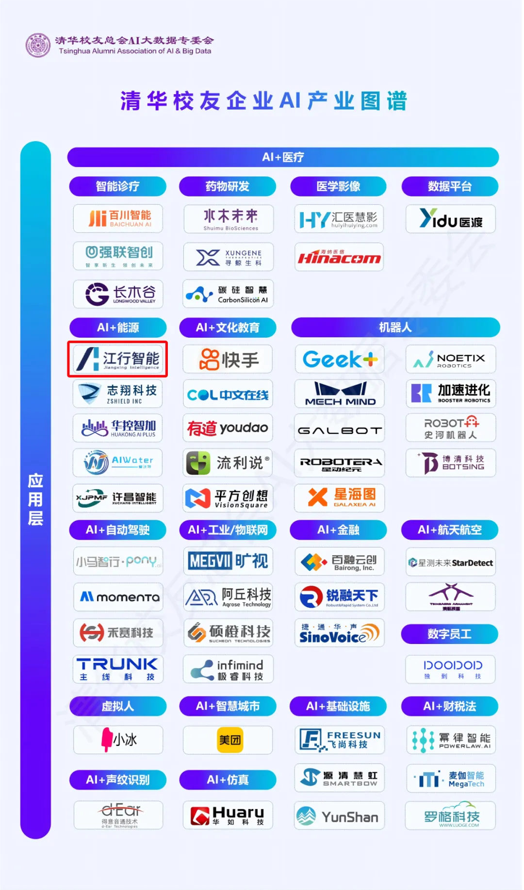 其中,江行智能凭借在“AI+能源”领域的突出表现,成功入选应用层,与众多优秀校友企业共同诠释“清华力量”在人工智能与产业深度融合进程中的示范作用。