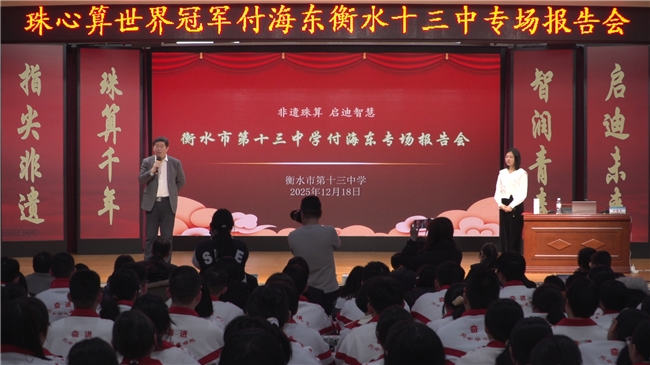 为传承中华优秀非遗,丰富校园文化内涵,提升学生综合素养,12月18日,衡水十三中特邀珠心算世界冠军付海东老师开展题为《非遗珠算 启迪智慧》的专场报告。社会各界来宾与我校全体师生齐聚一堂,共同“解码”珠心算的千年智慧。