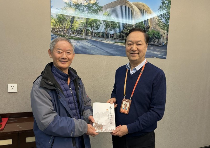 图为作者夏珺(右)2025年11月14日下午向笔者赠送《为了大地的丰收——夏珺作品集》。