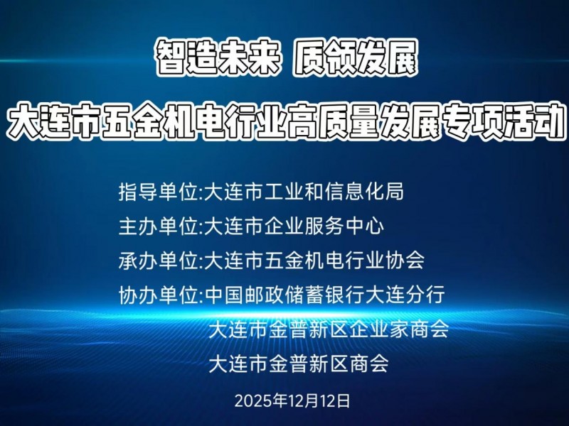 为推动大连市五金机电行业转型升级,助力企业抢抓发展机遇,12月12日,由大连市工业和信息化局指导,大连市企业服务中心主办,大连市五金机电行业协会承办,中国邮政储蓄银行大连金普新区支行、大连市金普新区企业家商会、大连市金普新区商会协办的大连市五金机电行业高质量发展专场活动顺利召开。政企学研各界代表齐聚一堂,共话行业发展趋势,共商产业升级路径。