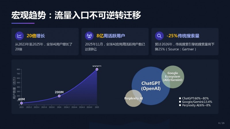 快快出海指出,预计到2026年,传统搜索引擎流量将下降约25%,用户行为正在从“搜索框”迁移到“对话框”。ChatGPT、Perplexity、Google AIO等生成式引擎快速普及,“问AI”成为首选信息入口,同时也是品牌流量和决策的关键节点。