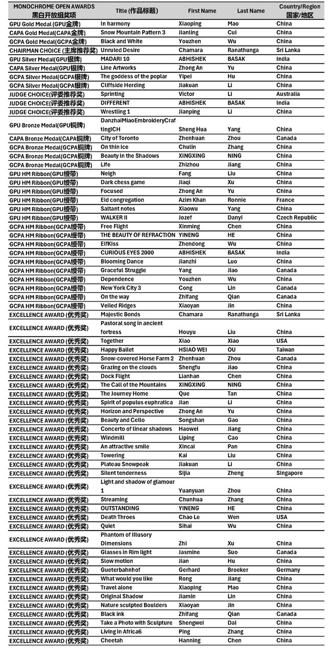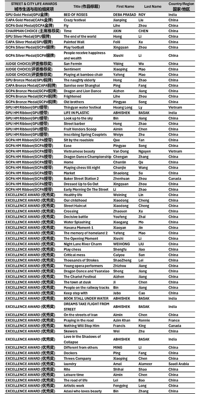 本届赛事共收到来自25个国家和地区摄影师投稿的近11,000幅作品,最终从彩色开放、黑白开放、自然、彩色风光(含无人机)、人主题与人物肖像、城市生活与街拍、AI新影像创意等七大类别中评选出457幅获奖作品。这些作品以多元的视角、真挚的情感与卓越的影像语言,呈现了摄影的广度与深度。所有获奖作品,将分期在本公众号陆续发布与分享,敬请关注。
