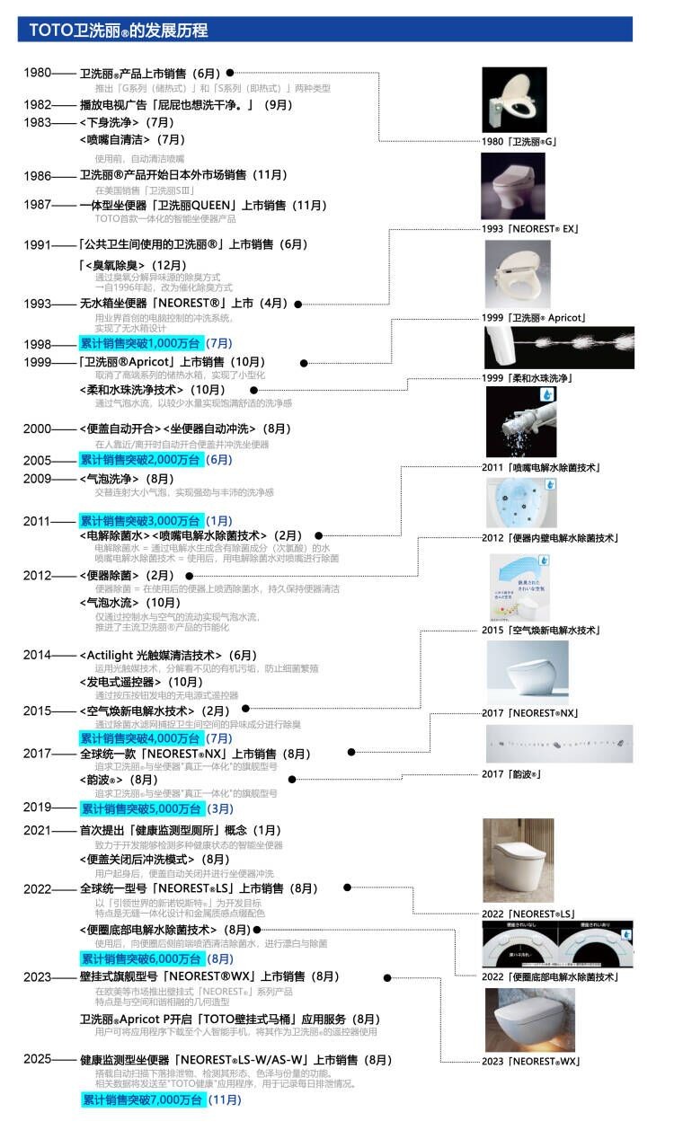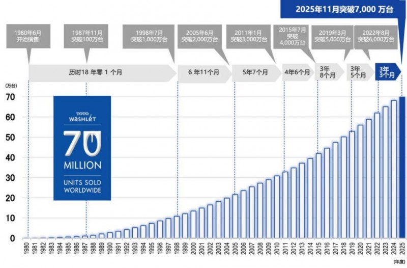 截至2025年11月,TOTO卫洗丽®产品累计销售量突破了7,000万台。(包含日本国内及海外市场的智能坐便盖类型及卫洗丽®智能一体型坐便器)。自1980年6月上市销售以来,历经45年5个月,卫洗丽®产品已被广泛应用于住宅、公共设施等各类卫生间中。此外,在美洲、欧洲、亚洲等日本以外市场,公司持续开展扎根于各地区需求的推广活动,使得需求进一步扩大,销售额持续增长。与此同时, 2025年8月上市的新产品,可以通过传感器扫描并测量便体,并将数据与应用程序联动,从而为日常健康提供支持。由此,公司提出了“关爱健康”这一新的价值主张。