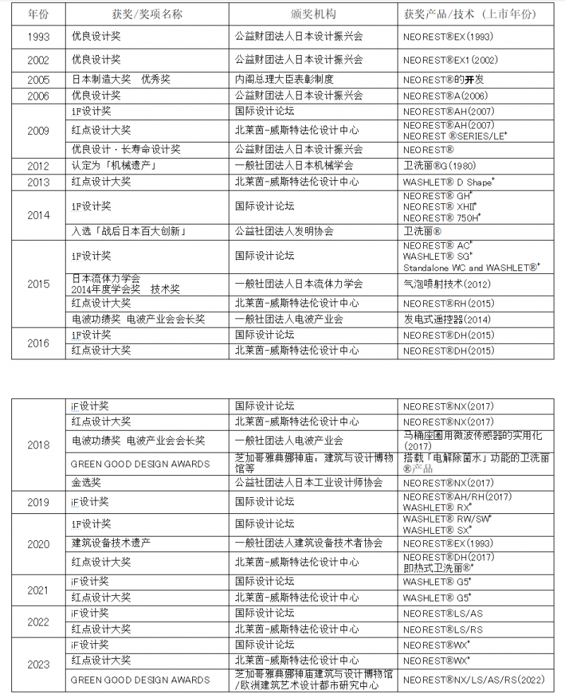 主要外部评价 *「卫洗丽」以及「一体型坐便器」 *面向海外市场