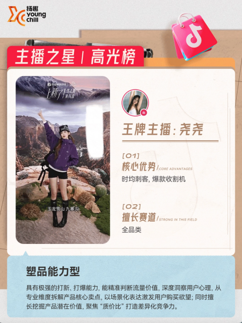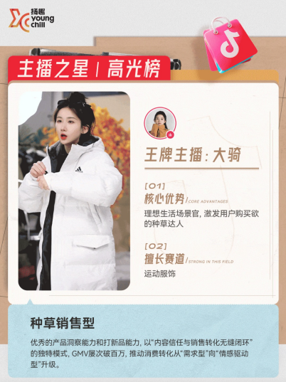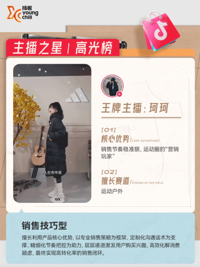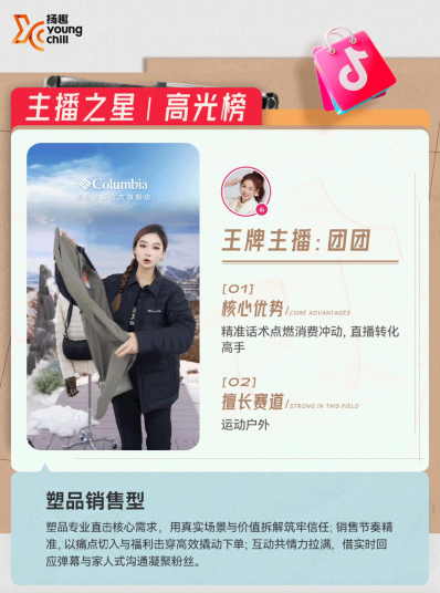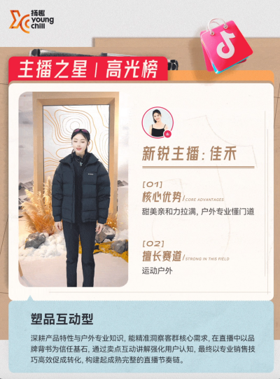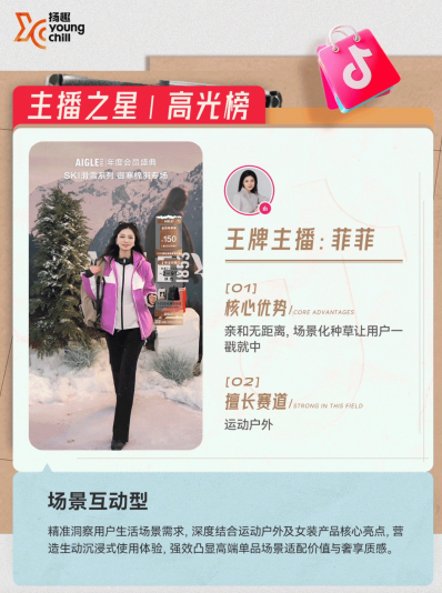 在碧橙数字子公司扬趣,每一位主播都是一颗独一无二的星星,他们用自己的光芒照亮了直播的舞台。“主播之星大促高光榜”上,王牌主播团团以精准的话术点燃消费冲动,成为直播转化高手;大骑作为理想生活场景官,以独特的种草模式推动消费转化升级;菲菲则以亲和无距离的场景化种草,让用户一眼即中;珂珂的销售节奏稳准狠,被誉为运动圈的“营销玩家”;尧尧作为爆款收割机,擅长挖掘产品潜在价值;新锐主播佳禾则以甜美亲和力和户外专业知识,构建起成熟完整的直播节奏链。