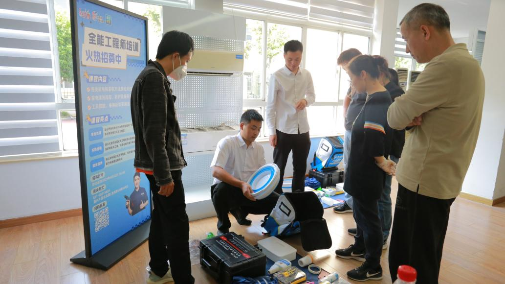 除此之外,为解决街道内维修师傅少、居民再就业困难的问题,永升服务在街道内开展“全能工程师”培训,课程涵盖空调、油烟机清洗与维修等理论与实践课程,由永升工程总监亲自授课,为街道内更多居民提供再就业技能支持,也为街道内输出更多专业维修人才。