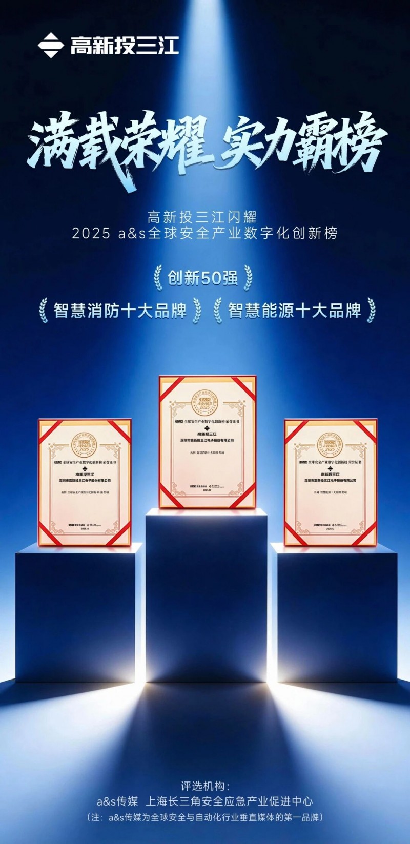 近日,全球安全产业权威媒体a&s主办的“2025 a&s全球安全产业数字化创新峰会及颁奖典礼”在上海盛大开幕。高新投三江凭借在消防数字化领域的深厚技术积累、创新产品体系及深度场景应用,一举斩获“创新50强”“智慧消防十大品牌”“智慧能源十大品牌”等多个重磅奖项,成为本届榜单中备受瞩目的焦点企业之一。