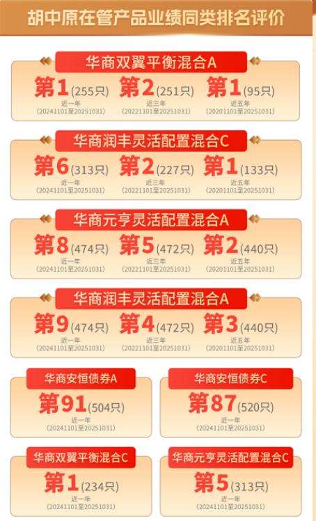 基金业绩同类排名评价数据由银河证券2025年11月发布,数据截至2025.10.31;华商润丰灵活配置混合A、华商元亨灵活配置混合A基金分类为灵活配置型基金(基准股票比例60%-100%)(A类);华商润丰灵活配置混合C、华商元亨灵活配置混合C基金分类为灵活配置型基金(基准股票比例60%-100%)(非A类);华商双翼平衡混合A基金分类普通偏债型基金(股票上限高于30%)(A类);华商双翼平衡混合C基金分类普通偏债型基金(股票上限高于30%)(非A类);华商安恒债券A基金分类普通债券型基金(二级)(A类);华商安恒债券C基金分类普通债券型基金(二级)(非A类)。