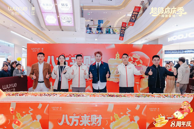 12月21日晚,晋江吾悦广场二号门外,一场别开生面的生日派对温馨上演。为庆祝八周年,商场特别定制了长达10米的巨型庆生蛋糕,与市民共同分享喜悦。活动现场人潮涌动,许多家庭携老带幼前来参与,共同唱响生日歌,场面温馨感人。