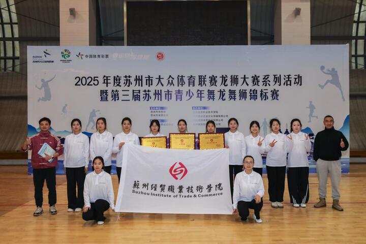 近日,2025 年度苏州市大众体育联赛龙狮大赛系列活动暨苏州市第三届青少年舞龙舞狮锦标赛,在苏州经贸职业技术学院体艺中心综合馆圆满落幕。作为联合承办单位,该校充分发挥高校在组织统筹、服务保障与文化育人方面的平台优势,以高度的责任感和专业的执行力保障赛事顺利举办,被主办单位苏州市体育局、苏州市体育总会授予“最佳竞赛组织奖”殊荣。这一奖项是对该校办赛团队专业能力与高效协作的充分肯定,也彰显了该校服务地方体育文化事业发展的积极作为与育人担当。