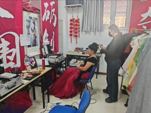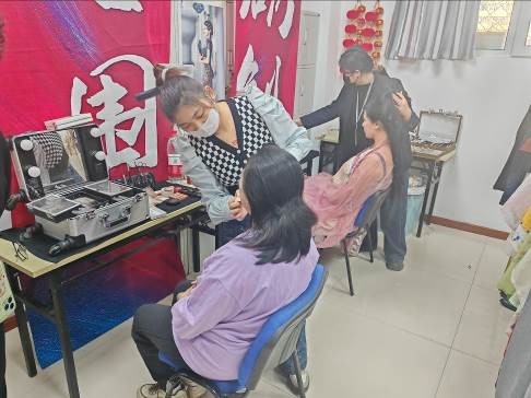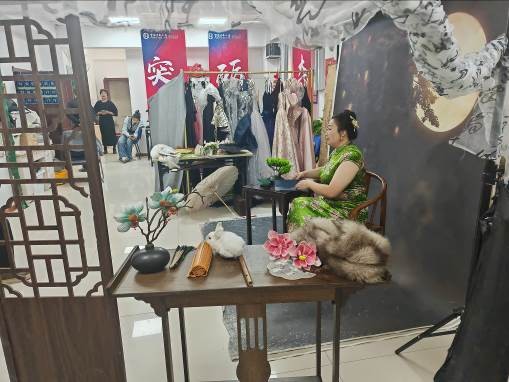 活动筹备阶段,洮南支公司的工作人员与摄影团队便对职场进行了精心改造:将职场巧妙划分出化妆造型区、服装选品区与拍摄区,古风屏风、中式茶桌、飘逸纱幔等布景营造出雅致的国风氛围,礼服、旗袍、时尚裙装等多种风格的服饰整齐悬挂,专业化妆箱、摄影灯、背景布等设备一应俱全。同时,公司还特邀专业化妆团队与摄影师到场,为客户提供全流程的造型与拍摄服务,力求让每位客户都能呈现出最佳状态。