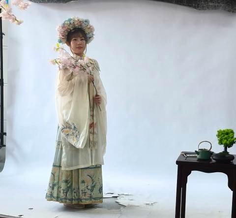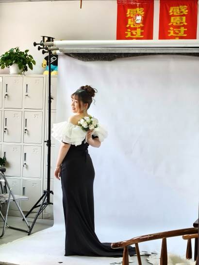 活动当天,客户们早早来到现场,在工作人员的引导下有序体验。化妆区内,专业化妆师细致地为客户打造妆容,从底妆的精致晕染到眼妆的细节勾勒,从古典发髻的编扎到时尚造型的设计,每一步都尽显用心;服装区里,客户们兴致盎然地挑选服饰,有人换上襦裙体验古韵国风,有人身着旗袍诠释东方优雅,还有人选择黑色礼服展现摩登气质。拍摄环节中,摄影师耐心指导客户调整姿势、放松表情,用幽默的话语化解大家的紧张感,“抬头浅笑一点”“手持团扇轻靠肩头”,随着快门的清脆声响,一个个灵动又美好的瞬间被永久定格。