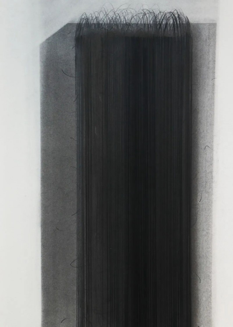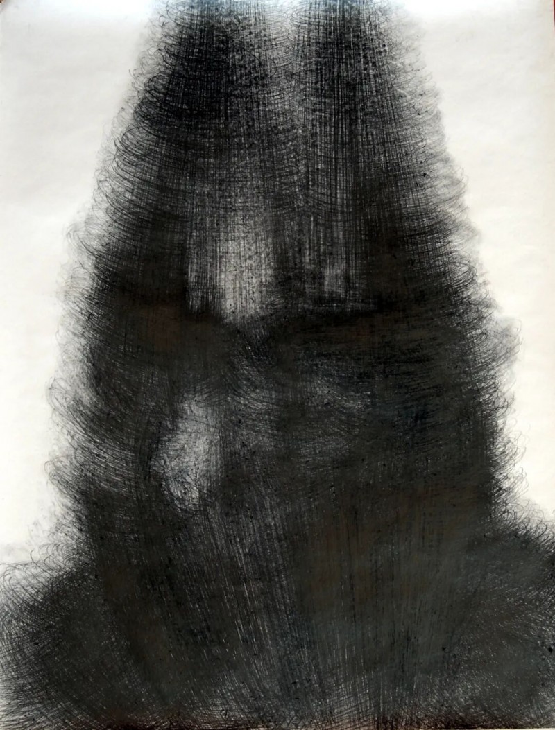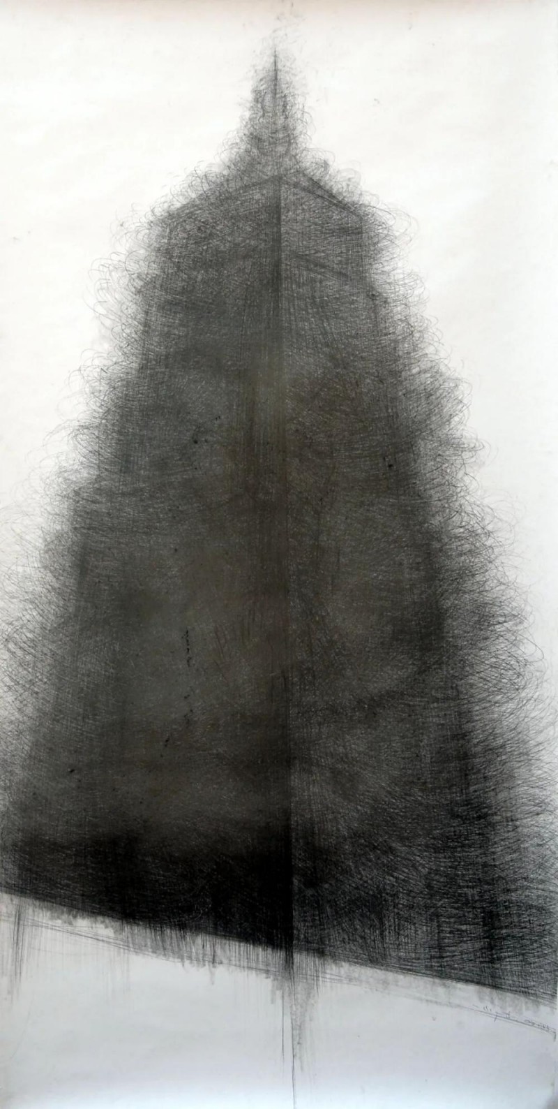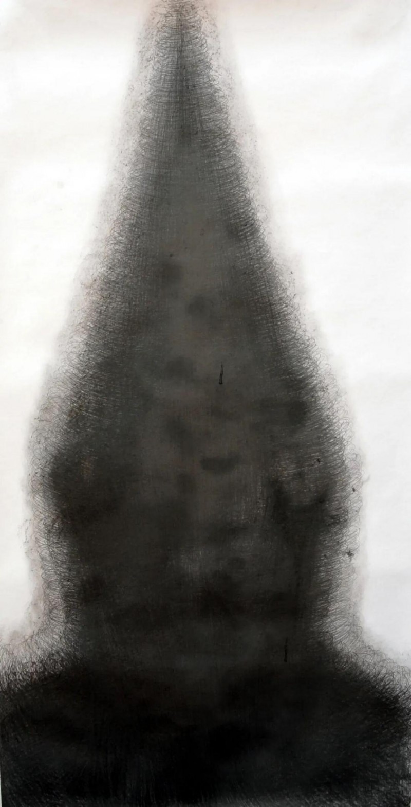 同样是心性、意象、情绪、材料和油色、水墨,以及数比、光影、线条、刮痕、结构等技法、元素的调遣与运用,细密重叠的水墨绘线越地拔高,交互构结直入云际的高大物象,在强烈压迫感中释放神圣、威严的内在情绪,让“浮图”、“父亲”和“我”以及“一个未实现的诺言”等不同绘画主题逐级升高,获得等同的品格位序,留下促人遐想的艺术空间。