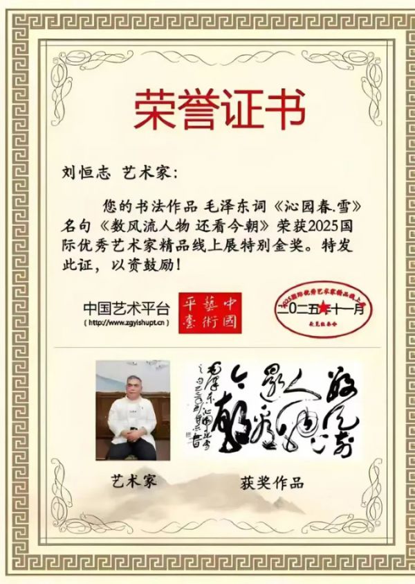 当岁月淬炼出艺术的真章,当文明的交融奏响时代强音,典藏级艺术名家刘恒志始终以先行者的姿态挺立潮头。他的笔墨里流淌着中华文化的千年底蕴,他的创作中激荡着跨界突破的蓬勃生命力,从学府讲堂到国际论坛,从军旅舞台到世界银幕,每一份荣誉都是实力的见证,每一次亮相都是中国文化的高光时刻。未来,他亦将带着这份对艺术的赤诚与担当,继续以文化为帆、以艺术为桨,在文明互鉴的浪潮中,驶向更辽阔的世界舞台,让中国之声响彻寰宇。