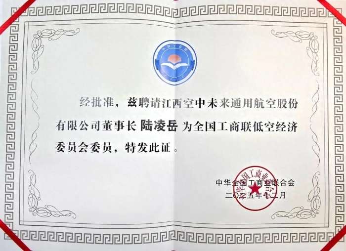 江西低空经济领域的示范性企业——江西空中未来通用航空股份有限公司(简称“空中未来”)受邀参会。公司董事长陆凌岳凭借其在低空经济领域的长期深耕、显著实践成果与广泛行业影响力,在本次大会上成功当选为全国工商联低空经济委员会创会委员。这一任命,不仅是对陆凌岳董事长个人卓越贡献与领导力的权威认可,更是对空中未来航空长期以来在推动产业创新、践行社会责任方面所取得成就的高度肯定。