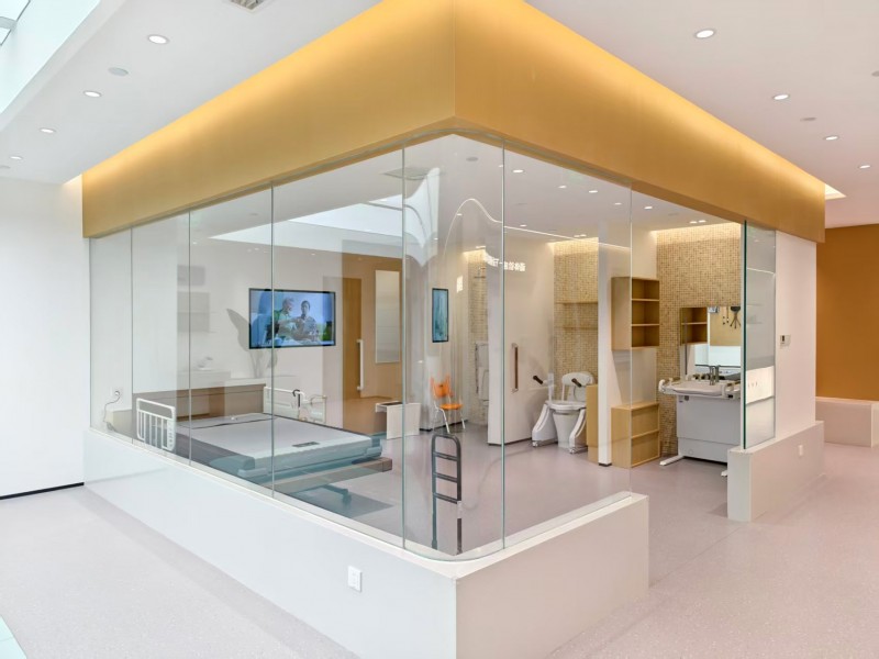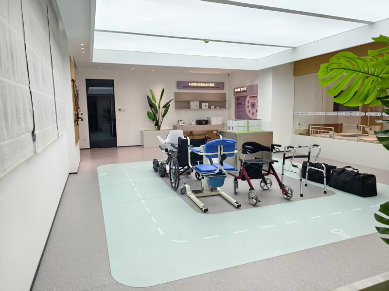 中心整体设计融合现代简约风格与适老化原则,内设品牌展示区、康养理念科普区、适老设施体验区等多个功能板块,使客户能够直观了解与体验公司康养服务体系,实现从保险产品向生活服务的价值延伸。在适老设施体验区,智能代步车、多功能遥控床、老年行动模拟装置等专业设备,系统呈现居家场景下的适老化改造方案;全生命周期健康与财富规划展示区,则清晰传达了“一代人投保、两代人受益”的跨代际养老服务理念。