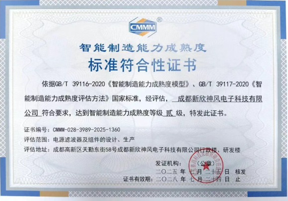 为此,企业坚定推动制造体系的智能化升级。经严格评估,其电源滤波器及组件的设计生产全流程,成功获得国家“智能制造能力成熟度二级认证(CMMM二级)”。这并非简单引进自动化设备,而是通过数据打通与流程重构,在核心生产环节建立了数字化管控体系。神风电子将工匠对质量的执着,转化为可量化、可追溯、可优化的工业语言,确保每一件交付的产品,都能精准兑现设计赋予的防护承诺,将“可靠性”锻入产品基因。