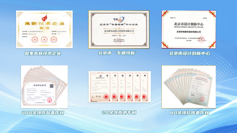 自2002年成立以来,妙音数科已构建起"数字国学IP×科技×衍生品×互联网"的四维商业模式,打造了垂直于国学领域的人工智能国学元宇宙科技产业链闭环。公司拥有国家高新技术企业、北京市设计创新中心、重点动漫企业等多项资质,知识产权超500项,并获得金鹰奖、熊猫奖等100余项奖项。