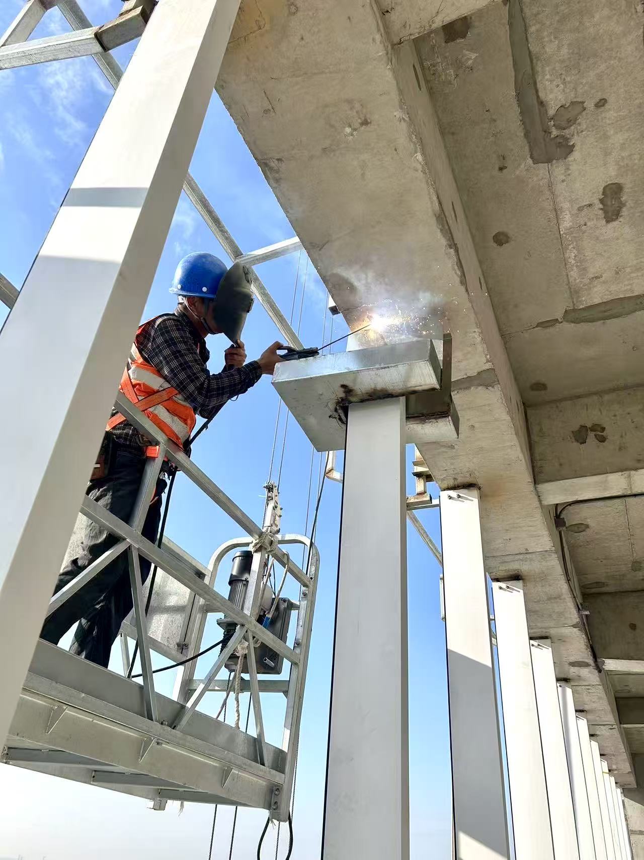 焊接工正在对幕墙立柱龙骨进行焊接
