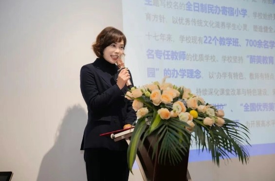 旭阳寄宿小学校长潘小丹女士紧接着作了系统汇报。她详细阐述了两校合作的五大特色亮点: