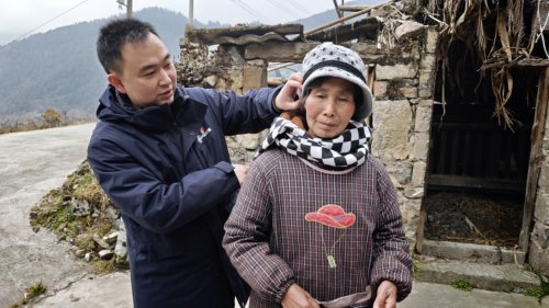 中国交建汉源九安公路项目党团员志愿者为顾奶奶穿戴棉帽围巾