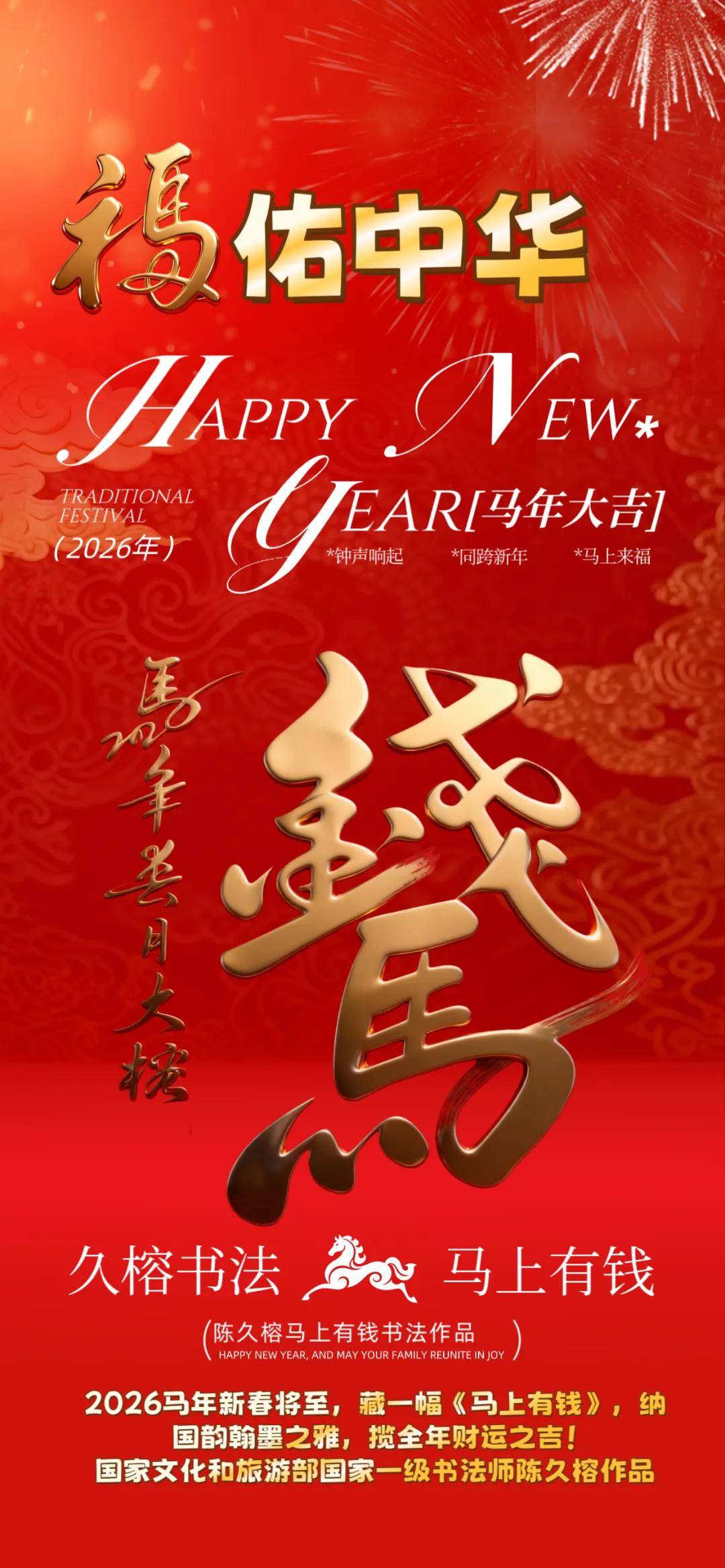 2026马年新春将至,国家文化和旅游部国家一级书法师、北京正阳门书画院名誉院长、福建省建材行业协会会长、福建多润斯涂料有限公司董事长陈久榕先生的贺岁力作《马上有钱》震撼首发。