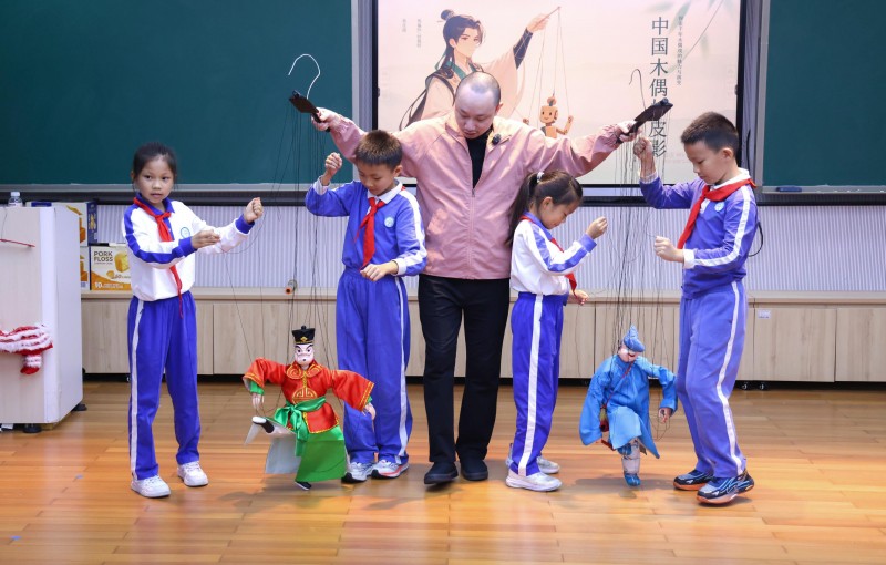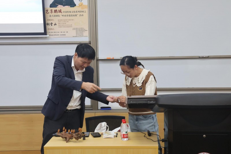 “艺+欢乐市民”板块的6 场传统文化讲座,核心并非 简单的“非遗展示”,而是实现传统艺术与当代生活的深 度对话,让文化遗产从“博物馆展品” 转变为“可感知、可运用的生活资源”。青年木偶表演艺术家蔡佳捷在荔园小 学的讲座中既带来精彩纷呈的木偶戏与皮影戏展演,又详解 木偶制作材料的独特质感、提线木偶关节的灵活构造,亲自 指导学生上台体验提线木偶与布袋木偶的操控技巧,通过知 识性与趣味性兼具的互动讲解,将非遗传承与青少年美育深 度融合,播下文化自信的种子;谢氏核雕传承人胡堂山在北 大深研院分享“5 分钟解析核雕核心”,与在校生问答互动,现场传艺,让匠心“于方寸之间”与当代青年形成共鸣。