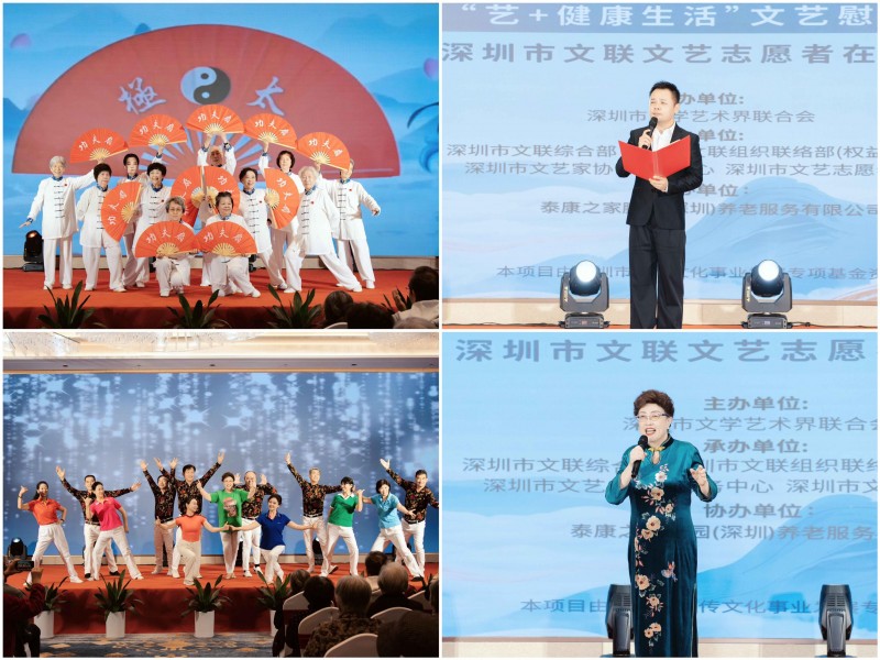 “艺+健康生活”板块的养老社区专场演出,彰显了文 艺志愿服务的“温度”与“精度”,其核心突破在于从“送 文化”到“送关怀”的价值升维。在大鹏新区泰康之家,舞 蹈《倍儿开心》的欢快节奏、朗诵《对衰老的回答》的深情 告白、互动点歌环节的乡音共鸣,构建起多层次的情感交流 场景。不同于传统慰问演出的“单向输出”,这场活动特别 设计了长者自发表演的环节,《中华太极扇》的整齐招式不 仅展现“老有所乐”的精神风貌,更让老年群体从“观众”转变为“参与者”,实现了文艺服务的双向互动。