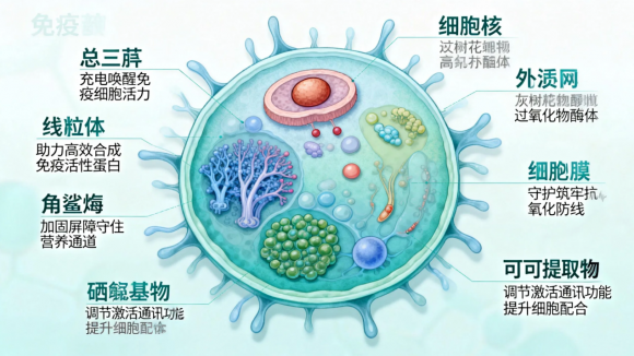 更让人惊喜的是,这款配方能精准作用于免疫细胞的线粒体、细胞核、内质网、高尔基体、细胞膜、过氧化物酶体、外泌体七大关键靶点。就像给免疫细胞配备了 “全链条养护方案”:总三萜给线粒体 “充电”,唤醒免疫细胞活力;灰树花提取物助力内质网、高尔基体高效合成免疫活性蛋白;角鲨烯加固细胞膜 “屏障”,守住营养吸收通道;硒酵母守护过氧化物酶体,筑牢抗氧化防线;可可提取物调节溶酶体、激活外泌体 “通讯功能”,让免疫细胞之间配合更默契。