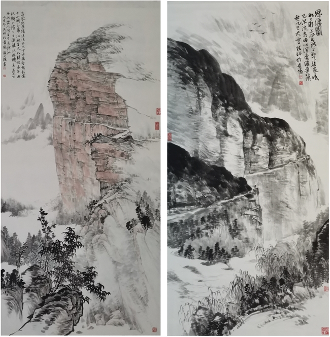 现场,一幅题画诗为“乌蒙绝壁锁清流,赤水空吟万壑愁。钎凿千山开玉带,汗凝百丈化银虬。当年血沃斜厂险,今日渠滋沃野畴。莫道天公无雨露,人间自可造沧洲。”的《绝壁天渠赋诗图》,采用高远之法构图,天渠仿佛自然生成,自右下凌空而起,向左上蜿蜒贯通,气势险峻,尽纳于方寸之间。笔墨简洁凝练,意态超脱,独具峻逸之神韵。另一幅《思源图》则别具一格,气势震撼人心。一道天渠如苍龙盘踞山脊,横贯于层峦叠嶂之中,深深嵌入绝壁。其工艺之精巧、气势之雄伟,令人赞叹不已。图题“思源”,如灵犀一点,道尽了此间开山引水、不忘初心的精神根源,意境深远,余韵悠长。如此,再细品题画诗,这两幅作品反映出作者深厚的书画造诣和文化素养,成为大美乌蒙一个艺术价值与精神力量相互辉映的文化象征。工作人员自豪地介绍,这两幅佳作出自生机镇本地书画艺术家张科(辰彦墨)之手。